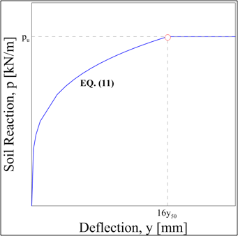 Matlock (1970) proposed a parabolic p-y curve shape (Eq. 1) characterized by a theoretical initial tangent modulus that is infinite at zero deflection. To formulate the initial tangent p-y stiffness, the soil strain, e, has been used. The ultimate capacity of the p-y curve, pu, is strongly dependent to the depth and the diameter (Eq. 2).